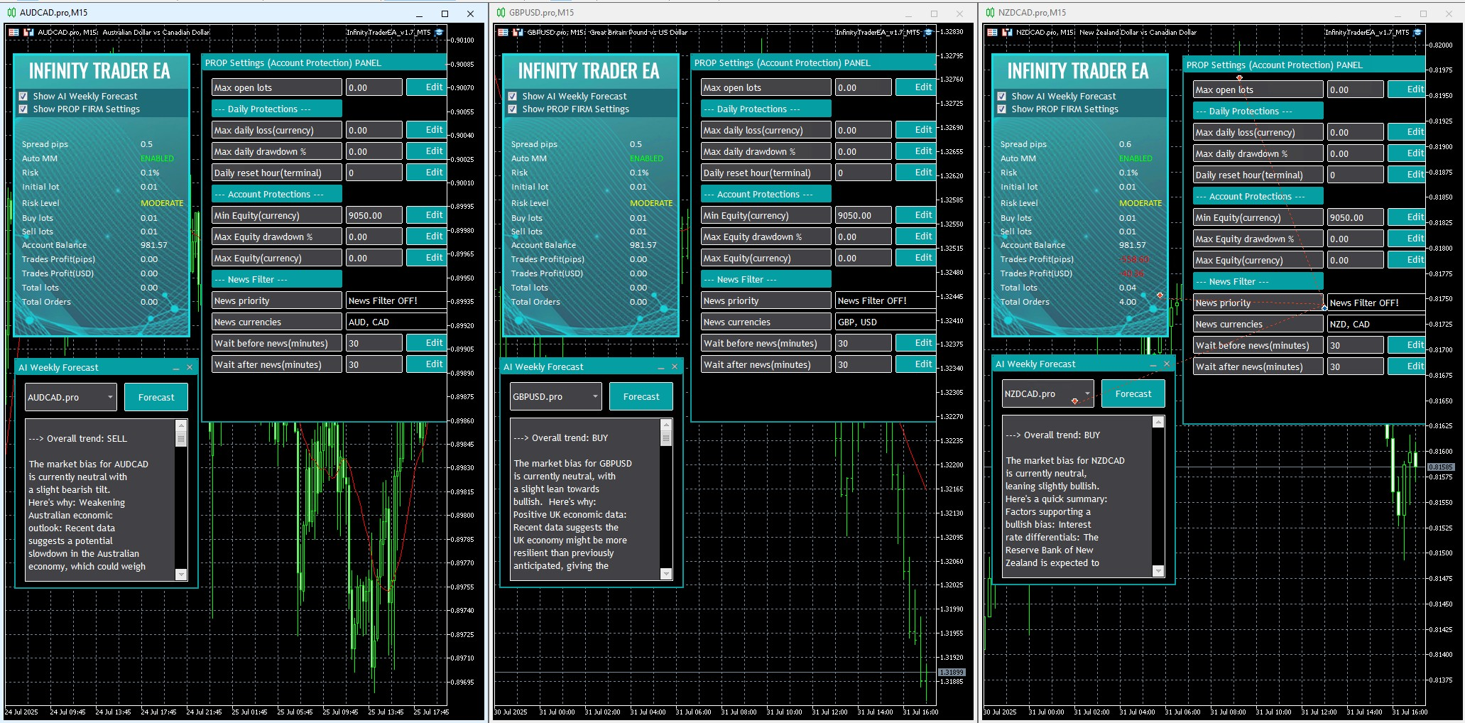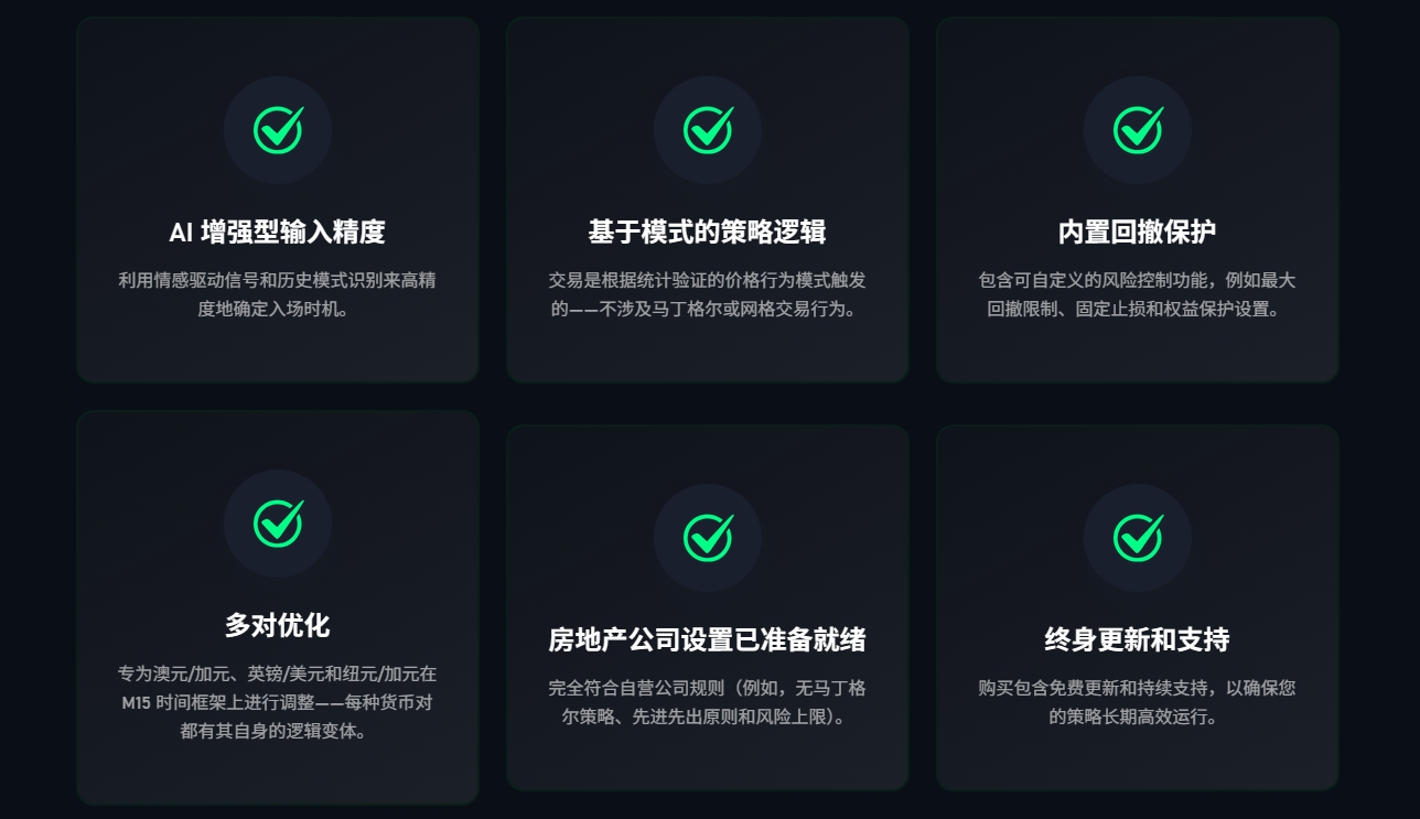 Infinity Trader EA 结合了成熟的价格行为模式逻辑和先进的 AI 情绪分析,可在 M15 时间框架下交易三大主要外汇货币对(澳元/加元、英镑/美元、纽元/加元)。该 EA 拥有长达 15 年的英镑/美元逐笔数据回测数据,并经过超过 1000 笔实盘交易验证,能够实时适应不断变化的市场动态。其最突出的优势在于完全集成的账户保护系统,该系统具备可自定义的回撤控制功能,兼顾增长与安全。