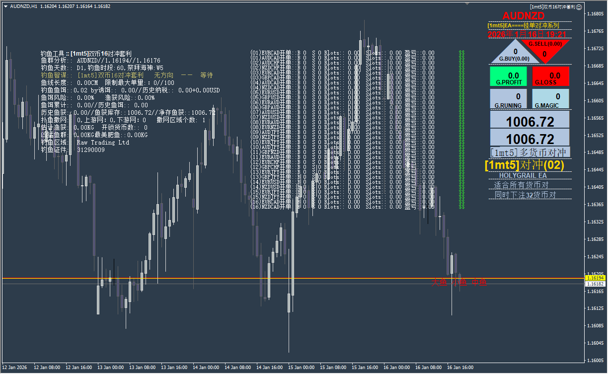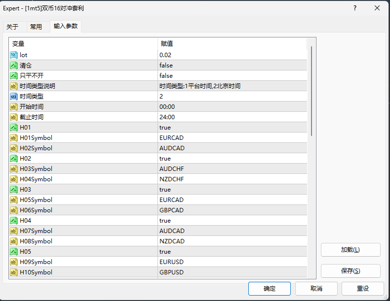 多品种配对对冲:EA 预设了 16 组交易品种(如 EURCAD vs AUDCAD,EURUSD vs GBPUSD 等)。这些品种通常具有高度的正相关或负相关性。