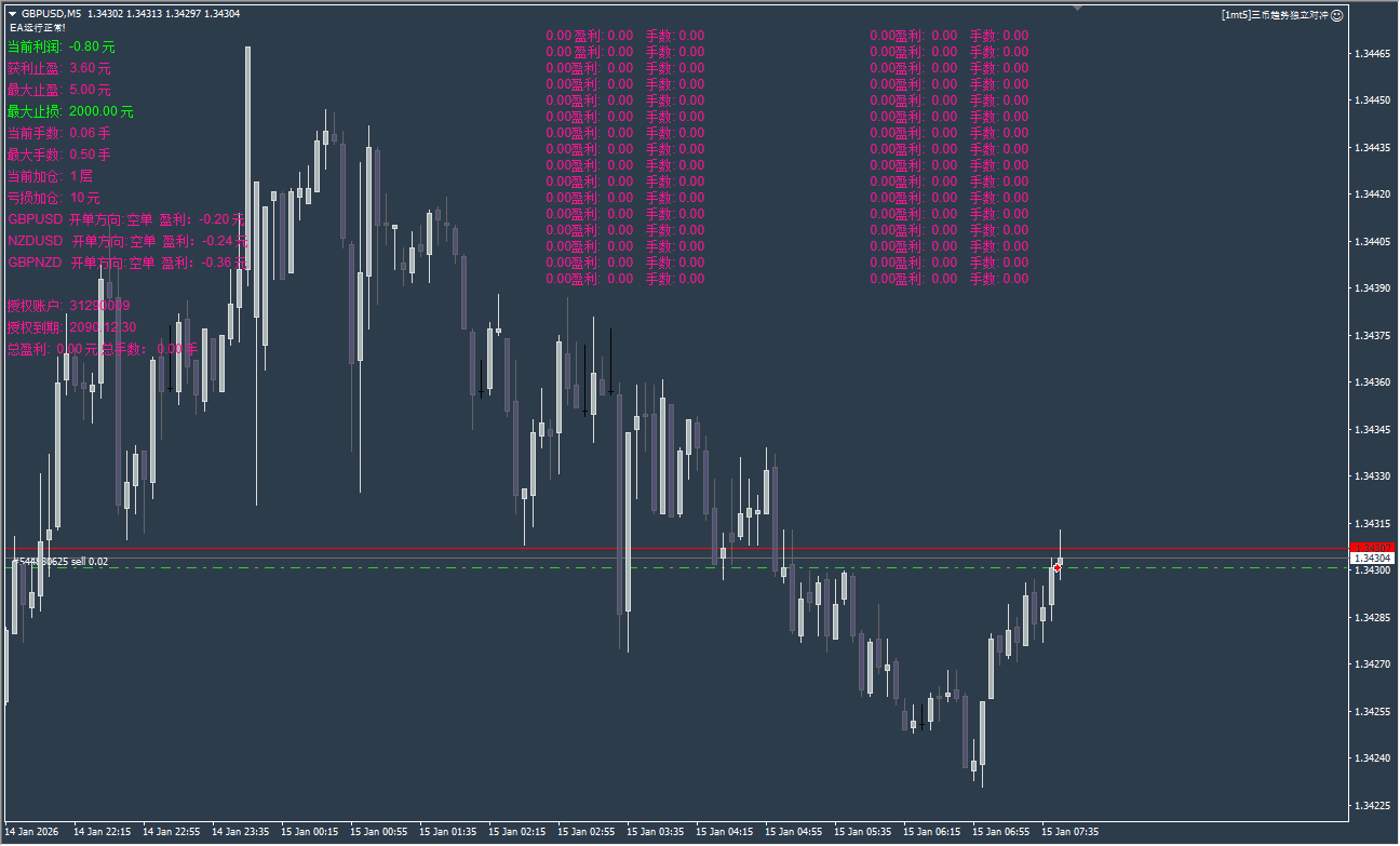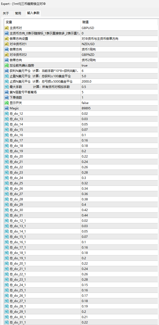 对比传统的单一货币对的网格马丁,本策略采用的对冲策略可以有效的避免单一货币对单边死扛的模式,减少扛单的风险性,能够快速的获利平仓及抵御较大的单边行情!策略采用总金额亏损加仓模式,3组货币对的亏损总金额达到系统的设置后会进入第二次开仓、第三次开仓、第四次开仓,到达设置的最大手数后停止开仓等待盈利或最大止损出场!