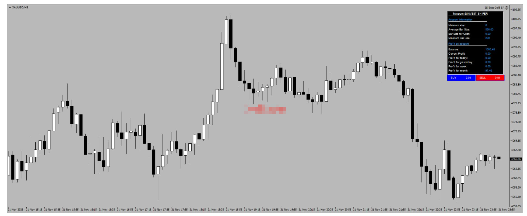 策略的环境依赖性:这套参数组合(如较大的最小K线尺寸和固定的止盈目标)可能更适应黄金市场出现单边趋势行情的表现。一旦市场进入震荡或无趋势状态,EA可能因频繁触发止损或无法达到入场条件而经历较长的回撤期。