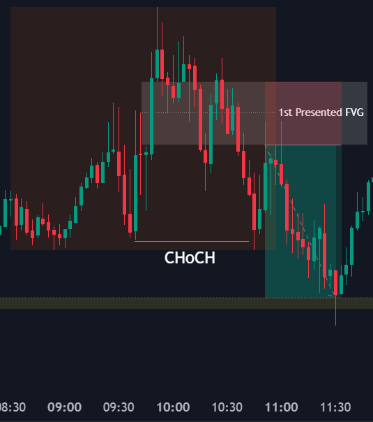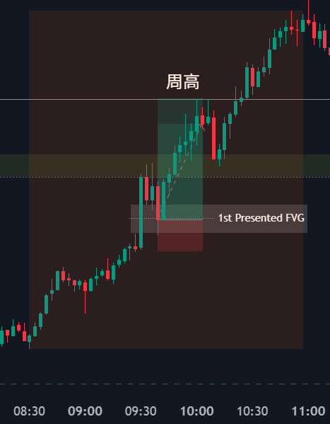 而1st Presented FVG (又称为 FPFVG, First Presented Fair Value Gap)就是指的是市场在开盘后第一次出现的失衡区,通常看 09:30 – 10:00 之间的 1 分钟或 3 分钟图。