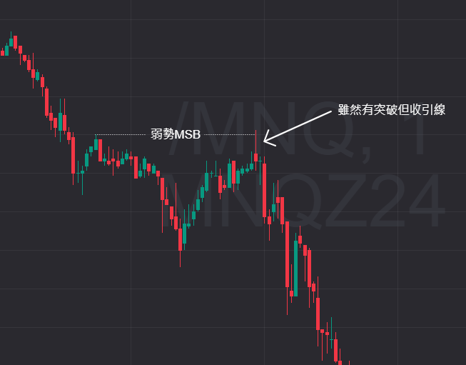 举例来说:如果价格尝试突破一个高点,但以影线收场,这就是一个弱势 MSB,这时候你要特别小心。