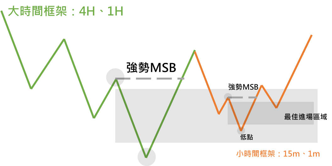 先在较高的时间框架(例如4小时图)上确认 MSB,然后切换到较低的时间框架(例如15分钟图),再重复一次相同的确认,去寻找更精确的进场点。这种方法让你可以更精准地进场,通常被称为“狙击进场”。透过这种方式,你可以在控制风险的情况下,获得更大的收益。
