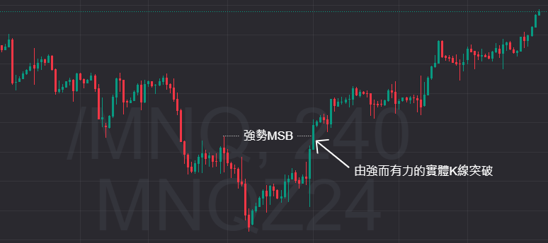 当价格强力突破了某个关键水平,并且K 线收盘在这个突破点之上,这就是所谓的强势 MSB。这种突破通常代表市场情绪发生了重大改变,后续的趋势反转机率很高。