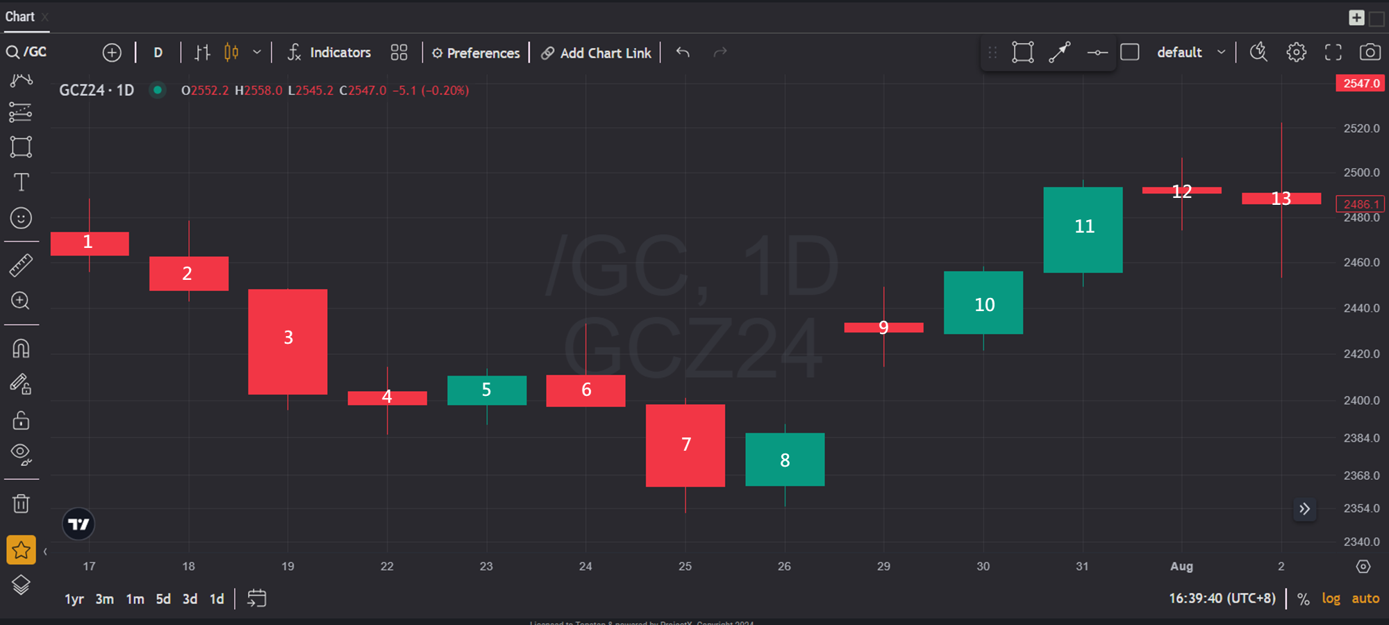 下面是黄金期货日K线,我把每根K棒都做了标记,方便理解。