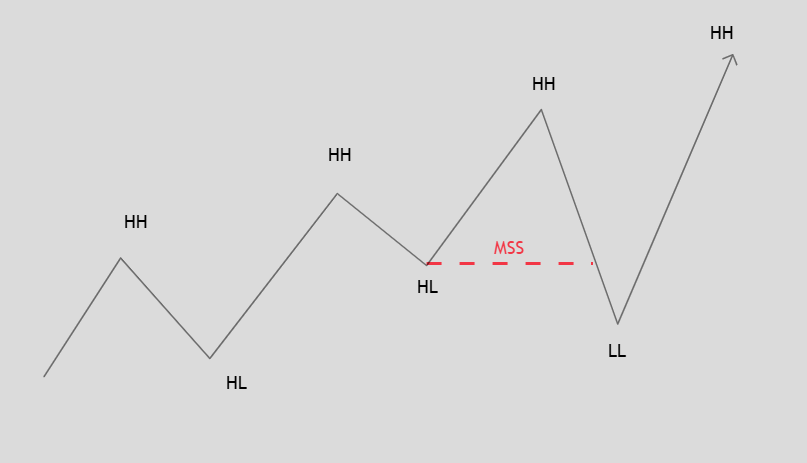 MSS / CHoCH 是指趋势转变的那一瞬间,例如原本是上升趋势(up trend),就是持续Higher High与Higher Low,也就是高点和低点都越来越高。直到有一次前低被跌破,产生了新的低点,只要原本的结构被打破,我们就说市场发生了结构转变,代表有一个新的力量打破价格原本的趋势。