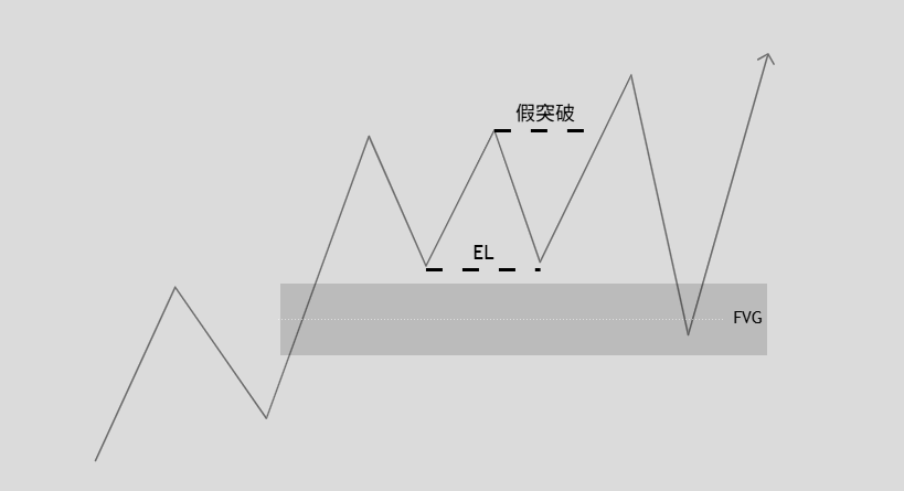 - 如果盘整下方还没出现过流动性猎取,那盘整下缘有可能是等低(EL)的状态,表示很多人在同一个位置买进,止损点也会差不多,因此存在大量的流动性,这对聪明钱来说是很强力的流动性磁铁,所以价格回到下方的可能性就比较大。