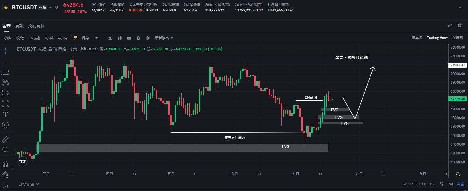 而价格下一个可能前往的地方,就会是盘整区间上缘的流动性池。即便我们在下方来不及进场,也可以等价格回到几个关键FVG后,去小时间框架找进场机会,抓住这个破底翻行情。